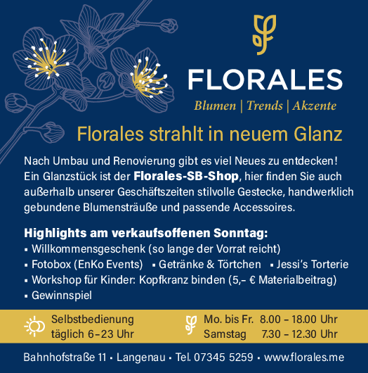 Am 5. Oktober von 12 bis 17 Uhr findet wieder der „Langenauer Herbst“ statt. Neben Shoppingspaß, dem beliebten Streetfoodmarkt dürfen sich Besucherinnen und Besucher auf mancherlei Überraschung freuen, die die Vielfalt und Leistungskraft der Einkaufsstadt Langenau vor Augen führt. Unternehmen aus den Bereichen Technik und Bau, sowie Gesundheit und auch Textilien oder Freizeitgestaltung aber auch viele Dienstleister und Gastronomen sind mit dabei. Neben den bereits bekannten Firmen präsentieren sich auch neue: 14 Kleinunternehmen haben sich im Schwenck-Areal im Pop-Up-Store „s’Nau-Fenster Langenau“ zusammengetan. Mit seinem Laden „Florales Blumentrends“ feiert Ingo Saur nach umfangreichem Umbau eine Neueröffnung. Neu in der Stadt ist auch das Braut- und Abendkleidergeschäft „I Am Curve“ sowie Daniela Galda mit ihrem Epigenetik Studio für DNA-Tests plus Zinzino-Shop.