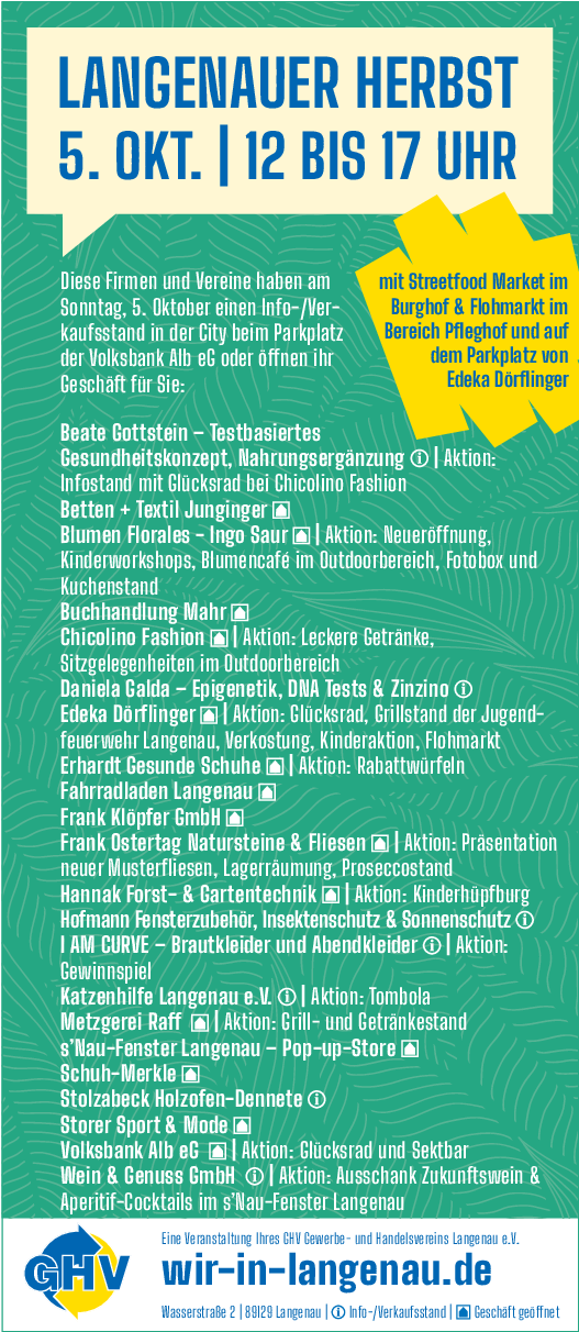 Der Gewerbe- und Handelsverein gibt einen Überblick über bevorstehende Veranstaltungen: das 6. Langenauer Wirtschaftsforum im Pfleghof am 14. Oktober, die zehnte Auflage des Langenauer Adventsloskalenders und vieles mehr.