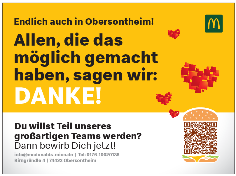 Der Standort in Obersontheim ist alles in allem ein besonderer, wie auch Bürgermeister Stephan Türke bei der Neueröffnungsfeier betont. Die Gemeinde zähle nun zu den Top-Fünf der kleinsten Kommunen mit einer McDonald’s-Filiale. Dennoch haben bereits die ersten Tage nach der Eröffnung deutlich gezeigt: Das Restaurant wird sehr gut angenommen. Und auch Michael Mion ist sich sicher: „Die Neueröffnung war ein Kraftakt, aber wir freuen uns sehr, auch hier eine Begegnungsstätte für die Region geschaffen zu haben.“ Alisa Grün