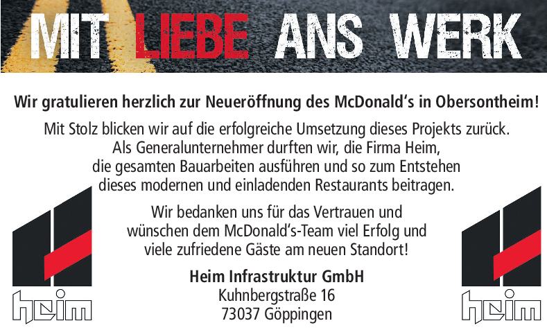Nur 17 Wochen nach dem Spatenstich eröffnete Ende Oktober das McDonald’s-Restaurant in Obersontheim – in Windeseile wurde gebaut, eingerichtet und in Betrieb genommen. Am 14. November wurde dann die offizielle Neueröffnung gefeiert. Das nahmen Franchisenehmer Michael Mion und seine Frau Kristina als Anlass, um allen Projektbeteiligten ausgiebig zu danken. „Es braucht nicht viele, aber viel“, macht Michael Mion deutlich. Ein detaillierter Plan, effiziente Dienstleister und sehr viel Unterstützung durch die Gemeinde sowie die unternehmenseigenen Experten haben es ermöglicht, das moderne Restaurant so bald wie möglich für die Gäste zu öffnen.