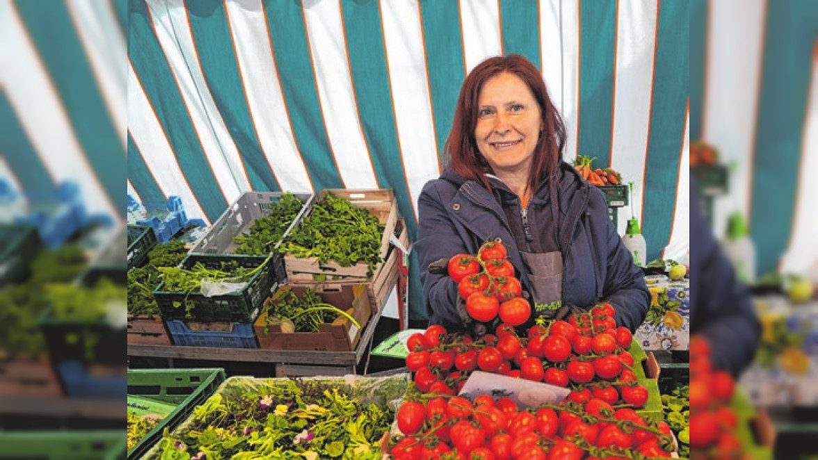 „Das sind die ersten deutschen Tomaten – noch aus dem Gewächshaus, doch regional. Es sind Hagedorn-Tomaten“, schlägt Marktfrau Erika vor und lässt probieren. Üppiges Salatgrün findet sich beim Gärtner nebenan: Kresse, Portulak, Feldsalat und Zuckerhut kommen schon aus Eigenbau, wie Mitarbeiterin Dorothea weiß. Ihre Kollegin Waltraud, die schon seit 14 Jahren im Geschäft ist, freut sich selbst auf die ersten Radieschen im Salat. „Viel mehr gibt es ja auch noch nicht“, bemerkt eine Kundin, mit der Waltraud ins Gespräch kommt: „Hier kennt man sich, das ist wie auf dem Dorf“, schwärmt sie. Beim Blick auf die vielen Grüntöne der Salate, dazu die roten Radieschen, wird klar: Als Vorspeise gibt es Blattsalate.