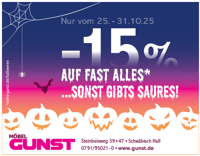 Eine große Schüssel mit leckeren Süßigkeiten gibt’s beim Haller Möbelhaus Gunst rund um Halloween zwar auch – doch die eigentlichen Leckerbissen sind die Angebote! Mit der Aktion „Happy Halloween“ läuten die Haller Einrichtungsprofis das Ende des Sommers ein und lassen kräftig die Preise purzeln: Von Samstag, 25. Oktober, bis Freitag, 31. Oktober, gibt’s 15 Prozent Rabatt auf fast alles.