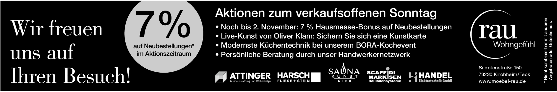 Am verkaufsoffenen Sonntag am 2. November 2025 heißen rau Wohngefühl und Attinger Raumausstattung alle Interessierten herzlich willkommen – im Showroom des Möbel- und Küchenhauses im Handwerkernetzwerk, 2. OG bei rau Wohngefühl. Besucherinnen und Besucher können das Konzept „Wohnen in allen Varianten“ live erleben: