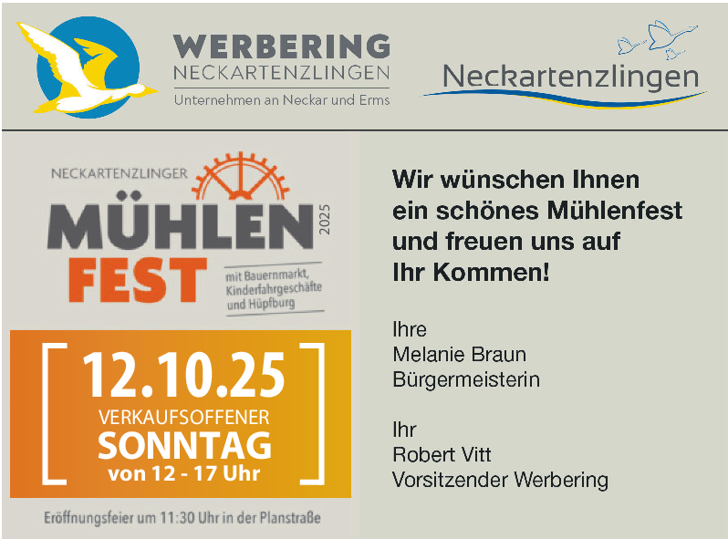 Das Mühlenfest selbst blickt auf eine lange und bewegte Tradition zurück: Seit dem Jahr 1996 bringt der Werbering Neckartenzlingen die Menschen aus der Gemeinde und der Umgebung jedes Jahr aufs Neue zusammen. Mit viel Herzblut und Engagement wird dieses Fest organisiert, um die Gemeinschaft vor Ort zu stärken und ein lebendiges, gemeinschaftliches Erlebnis zu schaffen. Unter dem Motto „Gemeinsam stark in der Region“ feiern hier Unternehmen, Familien, Vereine und Besucher ein buntes und fröhliches Fest. Die besondere Atmosphäre und die vielfältigen Angebote sorgen dafür, dass das Mühlenfest auch in diesem Jahr wieder viele Menschen begeistert und den Herbst mit Freude und Leben erfüllt.