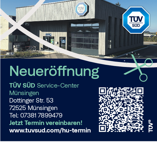 Auf versiegelte Flächen wurde so weit wie möglich verzichtet, bestehende Bäume konnten erhalten werden. Neben der modernen Architektur sticht das innovative, lichte und einladende Einrichtungskonzept hervor. Mit dem neuen TÜV-Gebäude reagiert der Konzern auf die wachsende Nachfrage nach Mobilitätsdienstleistungen für Auto-, Motorrad- und Lkw-Besitzer im Landkreis Reutlingen und darüber hinaus. TÜV Süd baute in Münsingen die nachhaltigste Prüfstelle im Biosphärengebiet Schwäbische Alb. Das neue Gebäude in der Dottinger Straße gilt sogar als die Musterprüfstelle des TÜV Süd für ganz Deutschland.