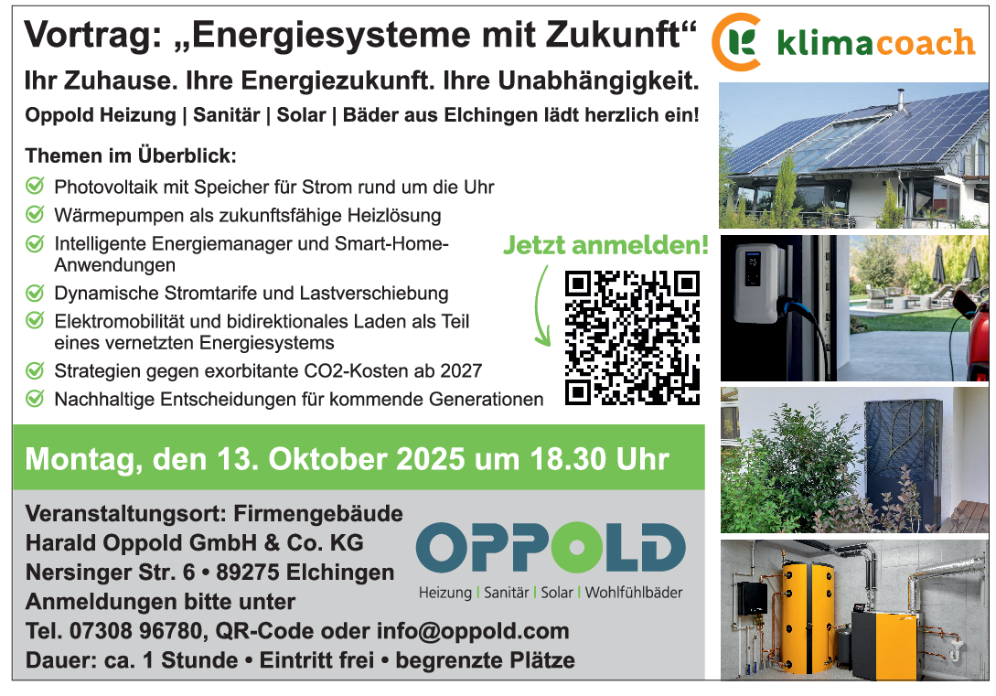 Die Firma Oppold, gegründet 1952 von August Oppold in Thalfingen, steht für handwerkliche Qualität über drei Generationen. Nach der Übernahme durch Harald Oppold im Jahr 1986 und dem Umzug in das neue Firmengebäude nach Unterelchingen 1997, wird der Betrieb nun an die nächste Generation übergeben. Felix Oppold tritt in die Fußstapfen seiner Eltern Harald und Annelies Oppold. Der gelernte Anlagenmechaniker SHK hat an der Hochschule Biberach Energie-Ingenieurwesen (B.Eng.) sowie Energie- und Gebäudesysteme (M.Sc.) studiert. Parallel dazu sammelte er umfangreiche Praxiserfahrung im elterlichen Betrieb. Seit August 2025 ist er nun Vollzeit im Unternehmen tätig, die Betriebsübergabe ist in vollem Gange. „Ich werde die Firma in der Familientradition weiterführen – mit derselben Leidenschaft, die unser Unternehmen seit jeher geprägt hat. Meine Schwerpunkte liegen in nachhaltigen Heiz- und Energiekonzepten sowie modernen Wohlfühlbädern“, betont Felix Oppold. Im Zuge des Generationswechsels lädt die Firma Oppold Kunden und Interessierte am 13. Okt. zu einem Vortrag ein. Thema: „Energiesysteme mit Zukunft – Ihr Zuhause. Ihre Energiezukunft. Ihre Unabhängigkeit.“ Die Veranstaltung zeigt praxisnah, wie Hausbesitzer ihre Energieversorgung nachhaltig, kosteneffizient und zukunftssicher gestalten können. „Ich freue mich sehr darauf, mit unseren Kunden ins Gespräch zu kommen und gemeinsam die Energiezukunft zu gestalten“, so Felix Oppold.