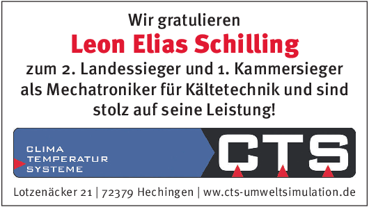 ▪ Mechatroniker für Kältetechnik Leon Elias Schilling in 72414 Rangendingen bei CTS Clima Temperatur Systeme GmbH in 72379 Hechingen