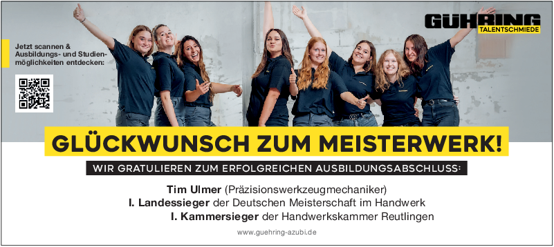 ▪ Präzisionswerkzeugmechaniker Tim Nico Ulmer in 72393 Burladingen bei Gühring KG in 72458 Albstadt