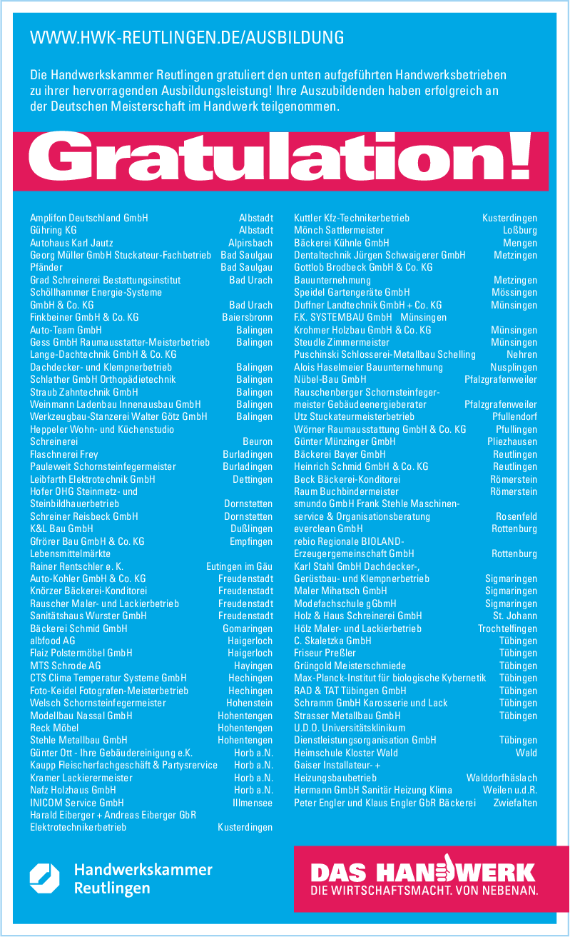„Die hohe Qualität der Leistungen, die unsere Nachwuchskräfte gezeigt haben, bestätigt die exzellente Ausbildung, die die Handwerksbetriebe im gesamten Kammerbezirk bieten“, sagt Christiane Nowottny, Hauptgeschäftsführerin der Handwerkskammer Reutlingen, die gemeinsam mit Präsident Alexander Wälde in Stuttgart die jungen Handwerkerinnen und Handwerker zu ihrem Erfolg beglückwünschte.