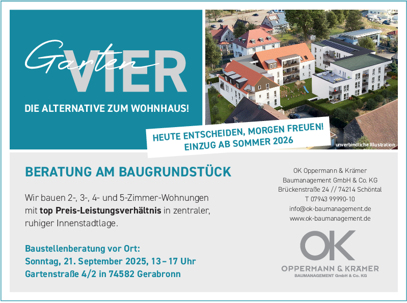 Das Projekt der Firma OK Oppermann & Krämer Baumanagement GmbH & Co. KG aus Schöntal wird seit Anfang des Jahres gebaut. Mitten in Gerabronn entstehen derzeit in zwei Wohnhäusern insgesamt 25 Wohnungen. Im Rahmen des öffentlich geförderten Wohnungsbaus werden elf Zwei-, Drei- und Vierzimmerwohnungen zu vergleichsweise günstigen Mieten angeboten. Nebenan wächst ein Gebäude mit 14 Eigentumswohnungen mit bis zu fünf Zimmern in die Höhe. „Die Wohnungen sind eine echte Alternative zu einem Einfamilienhaus“, betont Geschäftsführer Ralf Oppermann. Der Rohbau steht kurz vor dem Abschluss. Die Wohnungen werden nach den Innenausbauarbeiten bis Sommer 2026 bezugsfertig sein.