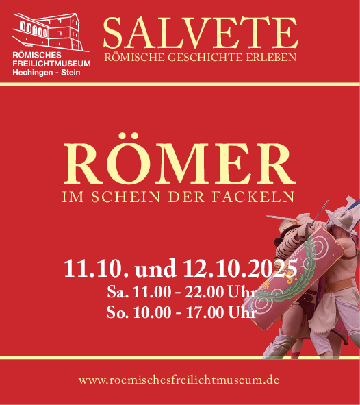 Am Samstag, 11. Oktober, von 11 bis 22 Uhr und am Sonntag, 12. Oktober, von 10 bis 17 Uhr lebt im Römischen Freilichtmuseum Hechingen-Stein die Zeit der Römer, Alamannen und Kelten wieder auf. Eigens aus der Schweiz werden die Gladiatoren der Gruppe Devis Militiae Jurae anreisen und ihr Können an beiden Tagen zeigen. Mit ihrer aufgrund von archäologischen Funden nachgebauten Ausrüstung treten sie regelmäßig zu Wettkämpfen an. Im April gewannen sie beim Turnier in Rom anlässlich der Veranstaltung „Natale“ den 2. Platz und sorgten mit ihrem Auftritt für eine wahre Sensation. Sie werden im Museum mit Spannung erwartet.