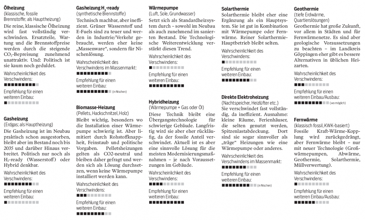 Es ist ein „Realitätscheck“ mit ungewissem Ausgang: Welche Heizung soll man einbauen? „Es ist manchmal ein Blick in die Glaskugel“, sagt Markus Ganßloser vom gleichnamigen SHK-Innungsbetrieb in Ebersbach. Vorgaben der Politik ändern sich immer wieder. Was heute richtig ist, kann morgen schon falsch sein. „Wir vermissen die Verlässlichkeit der Rahmenbedingungen, um unsere Kunden gut beraten zu können“, sagt er. Bei aller politischen Diskussionen- und „aufgeheizter“ Stimmung gibt es dennoch einige Fakten und Prognosen, die aus fachlicher und neutraler Sicht eine vernünftige Richtung vorgeben. Für uns haben die Expertinnen und Experten der SHK-Innung, einen Blick in die Glaskugel geworfen und die Perspektiven verschiedener Systeme zusammengestellt. „Die Übersicht ersetzt aber keine individuelle Beratung durch unsere Fachbetriebe oder einen Energieberater“, sagt Ganßloser. Denn: „Jedes Gebäude ist anders und man muss keine Lösung erzwingen, wenn sie nicht sinnvoll ist“, erklärt er. Das bedeutet aber auch: Man sollte nicht einfach aus Prinzip an einer gewohnten Technologie festhalten, wenn es bessere Alternativen und neue Möglichkeiten gibt. Constantin Fetzer