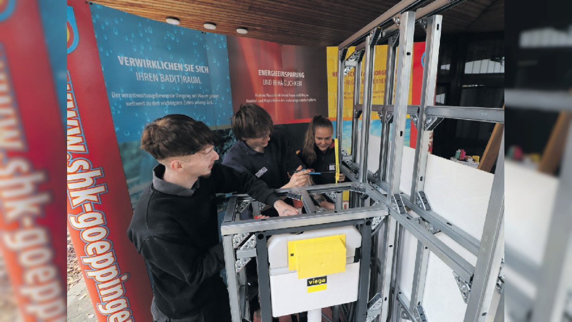 Für manch interessierte Blicke sorgten auch die Auszubildenden der SHK-Innung, die vor Ort ein komplettes Badezimmer aufbauten. Schritt für Schritt zeigten sie, wie aus handwerklicher Präzision, technischem Wissen und Teamarbeit ein modernes Bad entsteht. Besucherinnen und Besucher konnten dabei Fragen stellen und erhielten einen direkten Einblick in die tägliche Arbeit der SHK-Profis – von der Wasserinstallation bis zur ästhetischen Gestaltung.