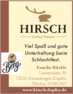 Seit 1969 zieht das Schlachtfest in Dapfen Gäste aus der Region und darüber hinaus an. Dieses Heimatfest ist fest verwurzelt in der Gemeinschaft und vor allem für die köstliche, lokal hergestellte Schlachtplatte bekannt. Die Festgemeinschaft zusammen mit den Fördervereinen des SV Lautertal und der Lautertalmusikanten serviert deftiges Kesselfleisch sowie Blut- und Leberwürste vom benachbarten Metzger. Ergänzt wird das Angebot durch würziges, selbstgemachtes Sauerkraut und frisches Bauernbrot aus dem Backhaus. Regionales Bier rundet das kulinarische Erlebnis ab und wird am Samstagabend um 18.30 Uhr beim traditionellen Fassanstich mit Zwiefalter Klosterbräu frisch gezapft.