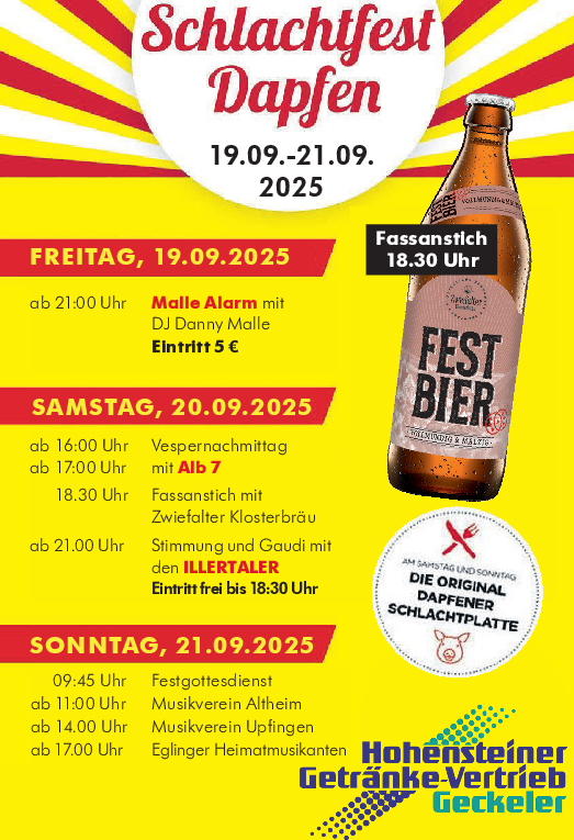 Der Sonntag steht ganz im Zeichen der Blasmusik und beginnt um 9.45 Uhr mit einem Festgottesdienst. Ab 11 Uhr spielt der Musikverein Altheim und schafft eine gemütliche und heitere Atmosphäre. Am Nachmittag übernimmt der Musikverein Upfingen ab 14 Uhr die musikalische Gestaltung, bevor die Eglinger Heimatmusikanten ab 17 Uhr das Fest zum Ausklang bringen. Auch an diesem Tag wird die Original Dapfener Schlachtplatte für höchsten Genuss sorgen. Maria Bloching