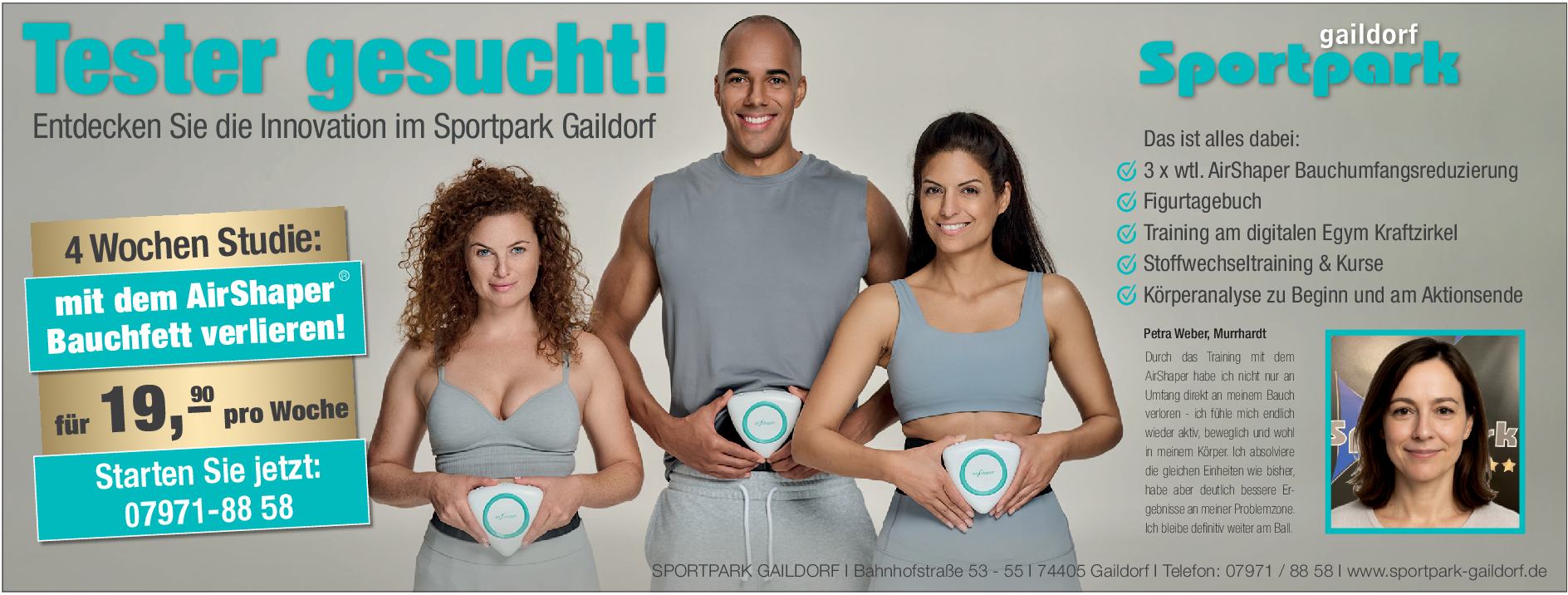 „Wir haben schon viel Gutes gehört. Deshalb haben wir uns entschlossen, das Konzept selbst zu präsentieren. Die ersten Ergebnisse sind vielversprechend. Unsere Kunden sind begeistert. Schon nach kurzer Zeit sind deutlich sichtbare und messbare Ergebnisse möglich. Und das ohne Pillen, sondern auf natürliche Weise mit jeder Menge Spaß und guter Laune!“, verspricht Siegmar Köger, Inhaber des Sportpark Gaildorf. Das etablierte Sportstudie in der Schenkenstadt ist einer der wenigen lizenzierten Stützpunktpartner in Europa, die für das erfolgreiche Figurformungskonzept wirklich infrage kommen. Der „AirShaper®“ basiert auf der innovativen Airpressure Bodyforming-Methode, die die Durchblutung im Bauchbereich gezielt fördert – und damit die Fettverbrennung bis zu achtfach steigert. Das wurde in einer wissenschaftlichen Studie des Instituts für medizinische und sportwissenschaftliche Beratung aus Österreich (IMSB) bestätigt.