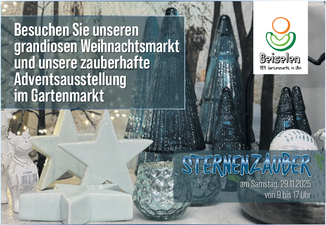 Beim „Sternenzauber“ am Samstag, 29. November zwischen 9 und 17 Uhr wird es im Gartenmarkt wieder glitzern und funkeln. Weitere Anbieter offerieren an diesem Tag Selbstgemachtes. Für eine Stärkung der Kundinnen und Kunden gibt es an diesem Tag Schmalzbrote und Glühwein.