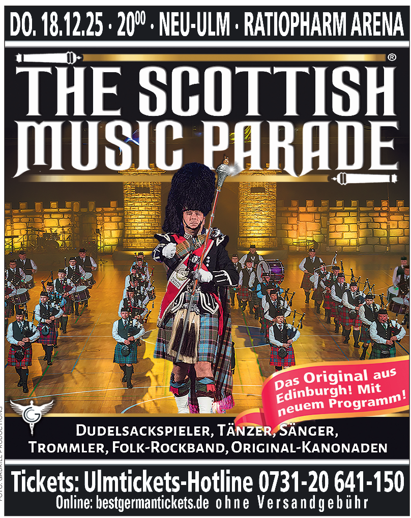 Echten keltischen Zauber und schottische Lebensfreude – das können die Zuschauer erleben, wenn „The Scottish Music Parade“ – das Original aus Edinburgh, am Donnerstag, den 18. Dezember um 20 Uhr mit ihrem neuen Programm „Now and Then“ nach Neu-Ulm in die ratiopharm arena kommt. Dudelsackspieler, Trommler, Musiker, Sänger und Tänzer, allesamt direkt aus Schottland eingeflogen, nehmen das Publikum mit auf eine ebenso mitreißende wie spannende und abwechslungsreiche musikalische Reise. Die mitwirkenden Künstler gehören zum Besten, was Schottland zu bieten hat.