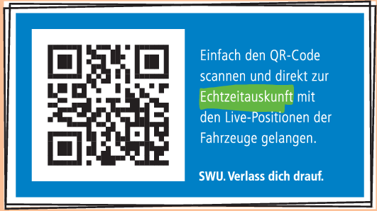 Nutzen Sie den ÜPNV als beste Alternative zum Auto. Besonders entspannt kommen Sie mit der Kombination aus Park & Ride und ÖPNV in die Stadt. Mit unserer Online-Echtzeitauskunft sehen Sie jederzeit, wann Bus oder Bahn fahren, wo es Verzögerungen gibt oder Fahrten ausfallen. Wir bitten um Verständnis: Das SWU-Team setzt alles daran, den ÖPNV trotz Baustellen so reibungslos wie möglich fließen zu lassen. Bei Stau sind aber auch wir von äußeren Faktoren abhängig.