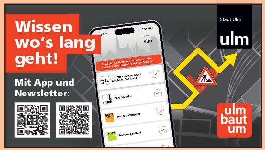 Der städtische Newsletter „ulm baut um“ erscheint wöchentlich. Zusätzlich gibt es seit Oktober 2024 die gleichnamige App, seit Juli 2025 auch mit den Neu-Ulmer Baustellen. Nutzer können Projekte in ihren Stadtteilen verfolgen oder Push-Nachrichten zu Großvorhaben wie Wallstraßenbrücke, Blaubeurer-Tor-Tunnel, Gänstorbrücke oder Adenauerbrücke abonnieren. Die Baustellen-App ist kostenfrei im Apple Store und Google Play Store erhältlich, bündelt alle Informationen auf einer Plattform und ermöglicht über die Kontaktfunktion direkte Rückfragen und Anregungen.