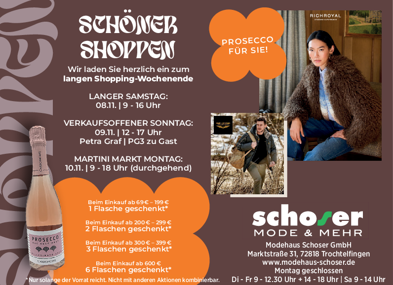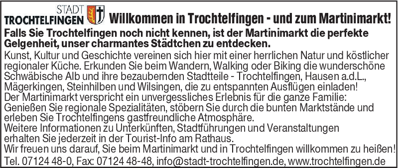 Somit bereitet der Einzelhandel von Samstag, 8., bis Montag, 10. November, ein besonderes Markt-Flair. Trochtelfingen lädt ein zu vielen leckeren Köstlichkeiten, zu Schönem und Gutem, zu einem erfolgreichen Einkaufserlebnis und zu jeder Menge Spaß und Unterhaltung. Maria Bloching