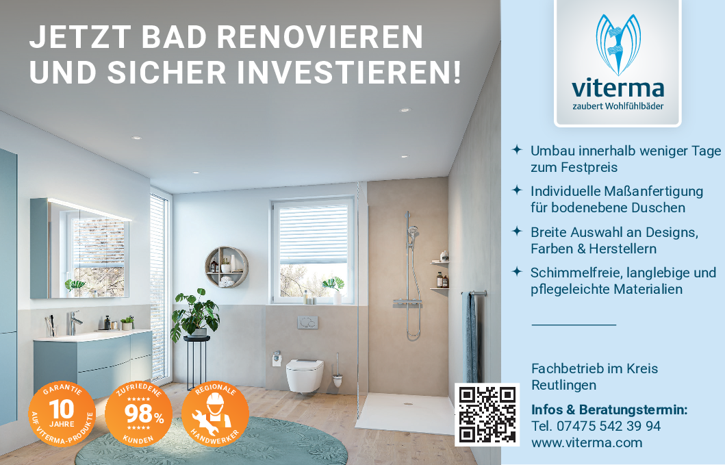 Die Badexperten von Viterma bieten ihre hochwertigen Badlösungen ab sofort auch im Kreis Reutlingen an. Maurice Rössler und sein Team verwandeln in wenigen Tagen auch Ihr altes Badezimmer in eine pflegeleichte Wohlfühloase.