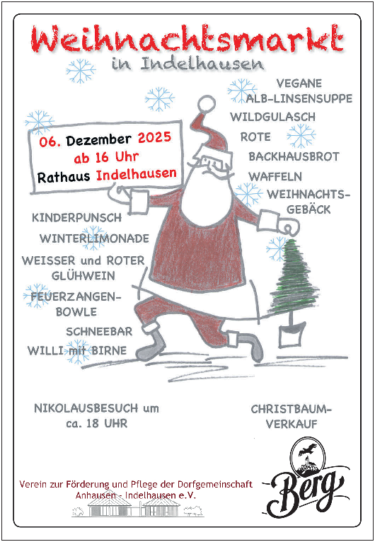 Der Weihnachtsmarkt in Indelhausen am 6. Dezember bietet den Besuchern Lichtermeer mit Schwedenfeuer, köstliche Leckereien, Glühwein, Früchtepunsch, Basteleien aus Naturmaterialien und vieles mehr.