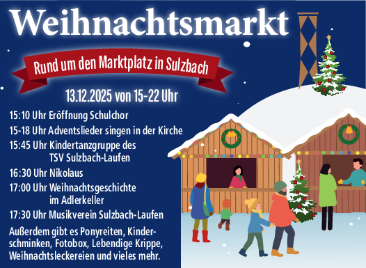Am Samstag, 13. Dezember, wird auf dem Marktplatz in Sulzbach von 15 bis 22 Uhr der 13. Weihnachtsmarkt gefeiert. Eröffnet wird er um 15.10 Uhr traditionell vom Schulchor der Kochertal-Grundschule. Um 15.45 Uhr tritt die Kindertanzgruppe des TSV Sulzbach-Laufen auf. Am Nachmittag wird der Nikolaus erwartet, der um 16.30 Uhr Geschenke an die Kinder verteilt. Heimelig wird es um 17 Uhr bei einer kleinen Weihnachtsgeschichte im Adlerkeller. Zum Abschluss des Weihnachtsmarktprogramms um 17.30 Uhr spielt der Musikverein Sulzbach-Laufen besinnliche und stimmungsvolle Musikstücke. Wer gerne selbst singt, kann von 15 bis 18 Uhr in die Michaelskirche kommen. Dort werden Adventslieder angestimmt. Vor der Kirche gibt es bei gutem Wetter Stockbrot.