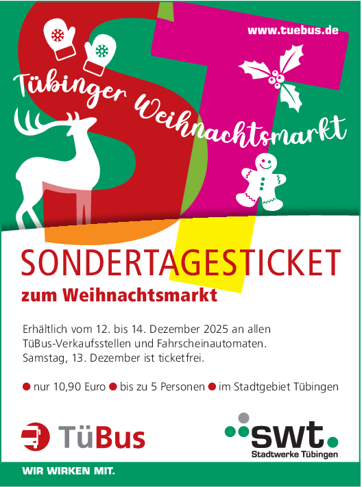 Der TüBus ist zum Weihnachtsmarkt besonders preisgünstig: Das Sondertagesticket für bis zu fünf Personen kostet 10,90 Euro pro Tag. Samstags ist das Busfahren in Tübingen auf allen TüBus-Linien sogar umsonst.