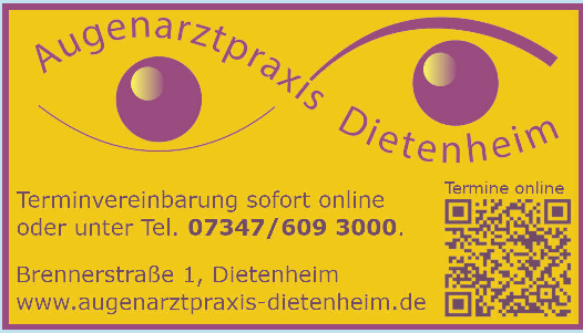 Neben Cindy Herrmann und ihrem Team sind Corina Müller seit über drei Jahren als weitere angestellte Fachärztin in der Praxis tätig. Herrmann arbeitet mit ihrer fachärztlichen Kollegin im Wechsel. Die beiden Ärztinnen können dadurch arbeitnehmerfreundliche Sprechzeiten bis 20 Uhr anbieten. Auf Nachfrage sei dienstags bereits ein Termin ab 6 Uhr morgens möglich, so die Ärztin. Termine können Patienten jederzeit online über die Internetseite der Augenarztpraxis, telefonisch und vor Ort vereinbaren. Während der Sprechstundenzeiten ist das Team der Augenarztpraxis Dietenheim auch telefonisch erreichbar. Das Praxisteam von Cindy Herrmann dankt seinen Patienten für das Vertrauen und steht für weitere Fragen sehr gerne zur Verfügung. Sabrina Hartmann