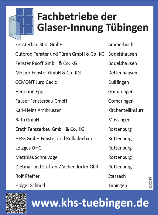 Die Glaser-Innung Tübingen kann auf eine lange Tradition zurückblicken. Seit 1920 gibt es den Zusammenschluss lokaler Fachbetriebe für Glas, Fenster und Fassaden und das wird gefeiert. „Wir hatten unser 100-jähriges Jubiläum leider während der Corona-Zeit, deswegen gab es eben dieses Jahr, zum 105. Geburtstag, eine große Jubiläumsfeier mit allen Innungsmitgliedern und einigen Lieferanten“, berichtet Obermeister Dieter Erath. Die meisten Mitgliedsbetriebe der Tübinger Glaser-Innung sind kleine und mittelständische Unternehmen, die sich vor allem auf Sanierung und Renovierung spezialisiert haben. Die Glaser-Innung Tübingen ist eine wichtige Instanz, um die Interessen der einzelnen Betriebe und Mitglieder zu vertreten. „Wir sind sehr breit gefächert und es ist eine angenehme Gemeinschaft, wo man sich austauscht und auch versuchen kann, über Gremienarbeit etwas zu erreichen. Die meisten Betriebe aus unserem Zuständigkeitskreis sind dabei, befürworten die Innung und bringen sich gern ein“, lobt Erath.
