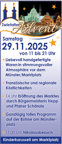 Die Adventszeit wird in Zwiefalten mit viel guter Stimmung vorbereitet: Am Samstag, 29. November, lädt die Gemeinde von 11 bis 21 Uhr bereits zum 29. Mal zum Weihnachtsmarkt ein.